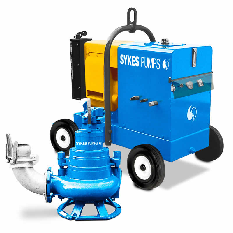 The Sykes 100 & 150 hydraulic submersible pumps are centrifugal solid handling submersible pumps that are ideal as the alternative to a diesel driven pump set when the lift required is more than 9 meters. The centrifugal pump is driven by an integral hydraulic motor which is fed by a 20 meter flexible hose from a hydraulic power pack which is powered by a silenced diesel engine.